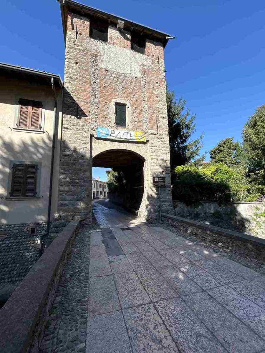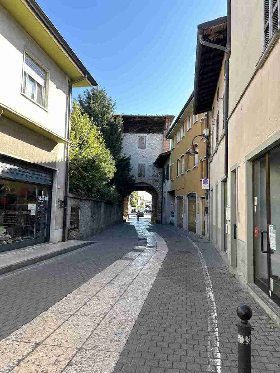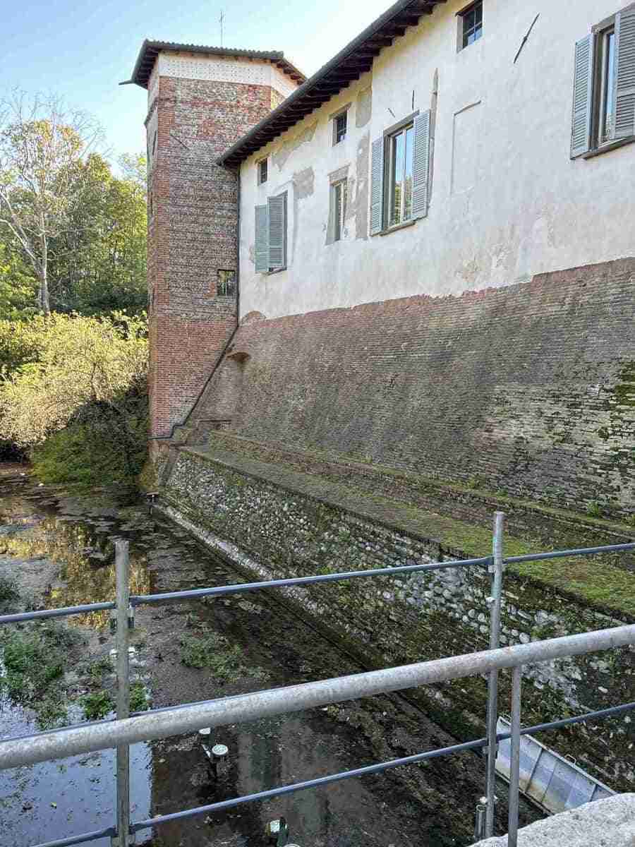 Proseguendo lungo la Via Riserva, costeggiamo i muri perimetrali del Parco del Castello sul lato sinistro, mentre sul lato destro della strada, seminascosto dalla vegetazione si trova il “Fosso Bergamasco”.