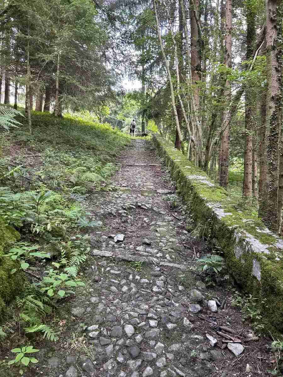 Per raggiungere le due frazioni di “Bosco Entro e Fuori” si prosegue lungo la strada e, volendo, si entra nel bosco lungo una mulattiera selciata, un po’ malmessa, che accorcia il percorso e permette di vedere la chiesa di San Rocco “spuntare” alla sommità del crinale.
