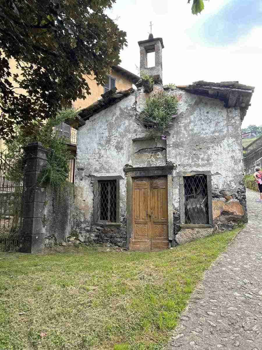 La facciata frontale è arricchita da un supporto in muratura per una campanella (che naturalmente non c’è più), una cornice incassata sopra la porta principale, probabilmente contenente un dipinto e due finestrelle laterali.
