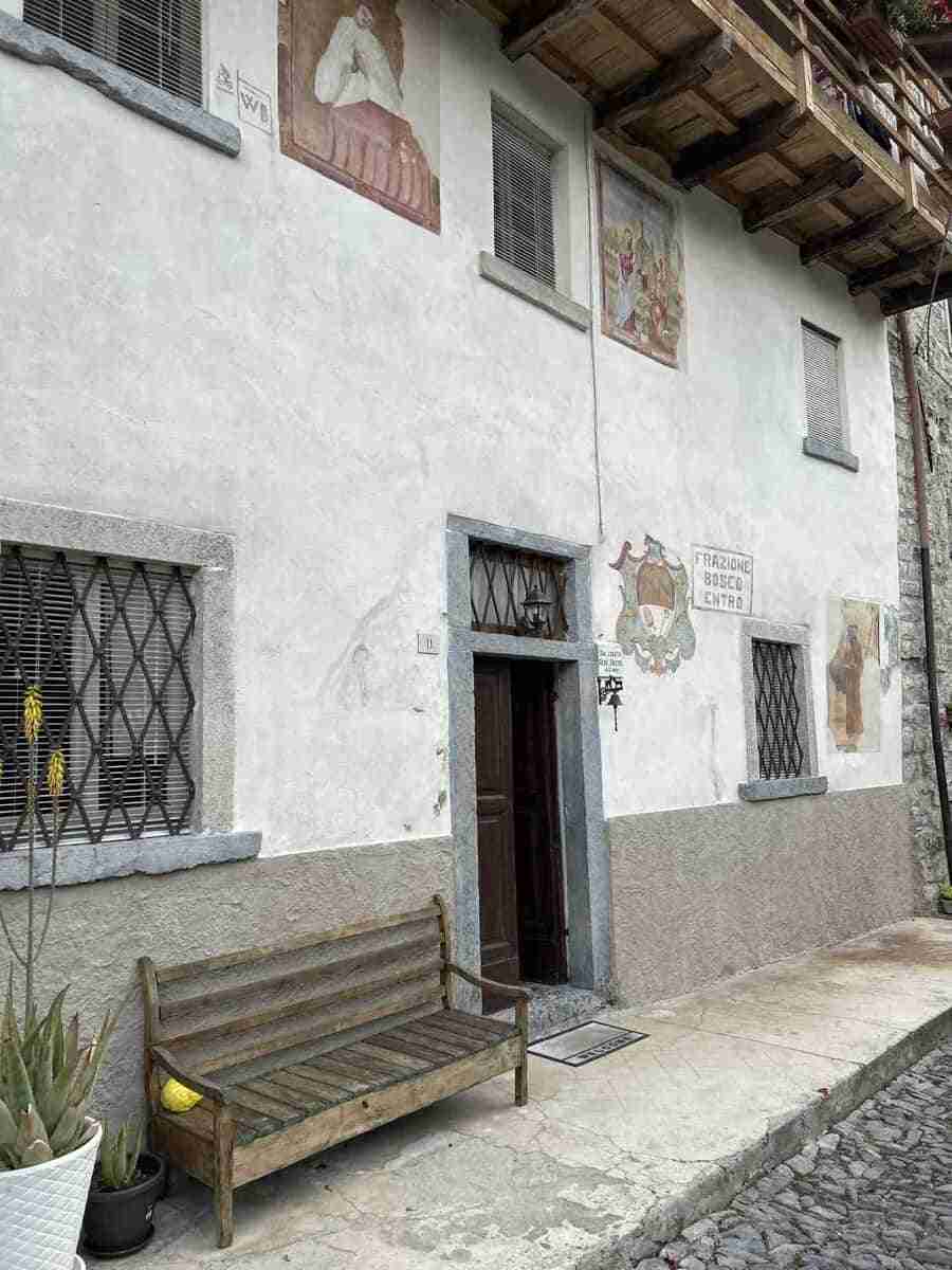 Lasciata la strada asfaltata e la Chiesa di San Rocco, si scende lungo un sentiero a destra per arrivare a “Bosco Entro”. Le abitazioni sono disposte accostate in un lungo caseggiato e la prima che s’incontra era la vecchia casa bianca del curato, decorata con affreschi dei santi e con l’insegna dipinta “Frazione Bosco Entro”.